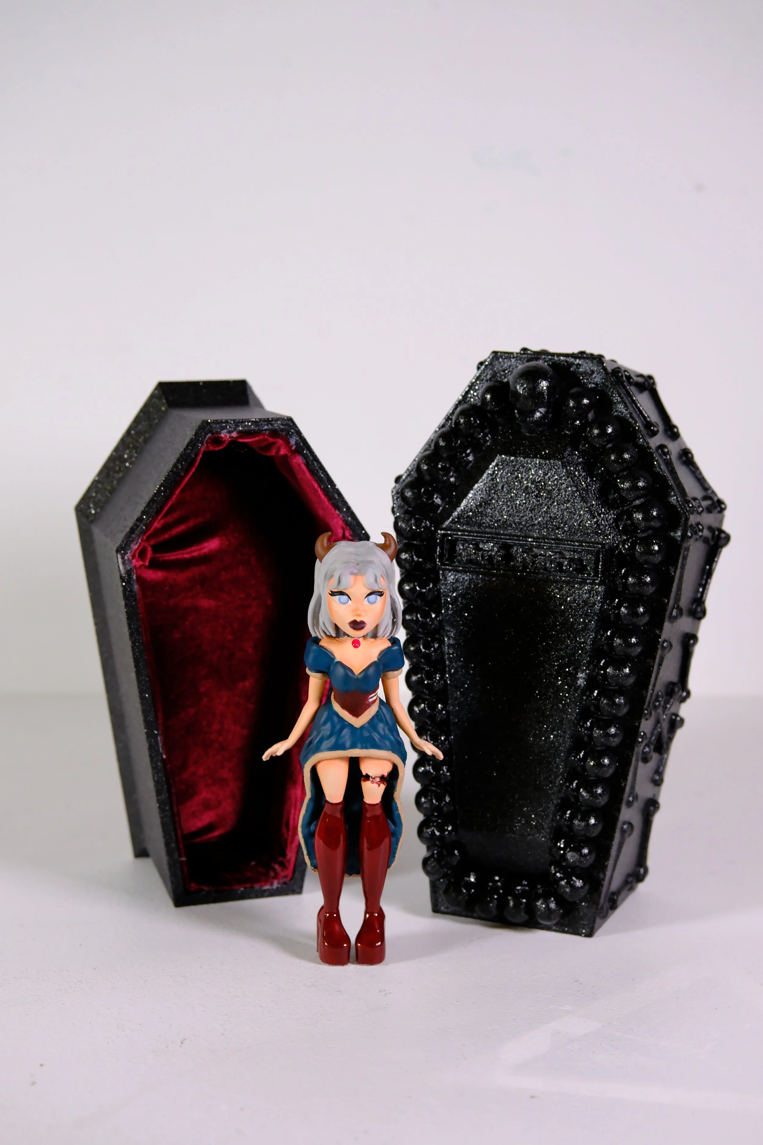 The coffin is designed to fit the doll snugly while serving as a narrative extension of the object. Its shape, scale, and structure were carefully considered to balance functionality with visual storytelling. The coffin was 3D printed and then treated with textured spray paint to simulate render materials. Branding elements and interior sculpting were added to complete the collectible experience, turning the packaging into part of the overall storytelling.